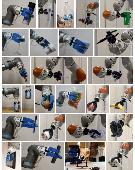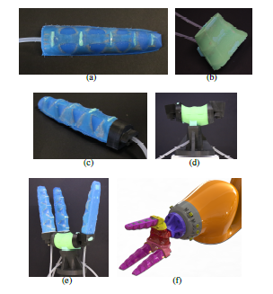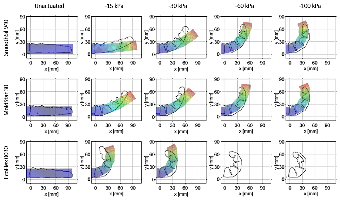 A finite element model using hyper-elastic constitutive relations showed good agreement with finger bending experiments and can be used to guide design iterations by predicting the impact of geometry and material selections. However, more work is needed to enable true design optimization of the multi-material composite structures used in the gripper. The main challenge in this front is the selection of appropriate constitutive models as dynamic applications (e.g. in-hand manipulation) will require the inclusion of visco-elastic effects. The gripper internal structures determine steady state maximum grasp poses and the soft skin material determines power requirements, actuation speed, and actuation stress. The silicone materials currently used are food safe, hypoallergenic, and can tolerate high temperatures providing a solid foundation for a broad range of applications.