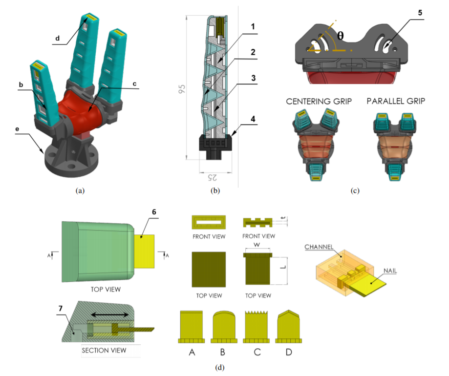 The finger nail mechanism is pneumatically actuated and enables the gripper to perform complex grasping and manipulation tasks with high repeatability. The retracted nails can exert normal grasping forces of up to 1.8N and enable grasping of objects up to 200µm thick from flat surfaces, while allowing the gripper to execute delicate pinch grasps.